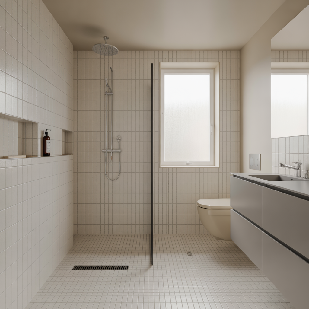 Vi har genomfört en komplett badrumsrenovering med ny rördragning och golvbrunn i Skogsäng, Rönninge, Stockholms län. Arbetet inleddes med statuskontroll av befintliga installationer, mätning av